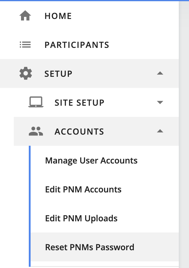 As a Council Admin, you can reset a Participant/PNM’s password for them. Changing a Participant/PNM's Password: 1. Click on "Setup" 2. Click "Accounts" 3. Click "Edit PNM Accounts." 4. Search for the participant whose password you want to reset. 5. ...